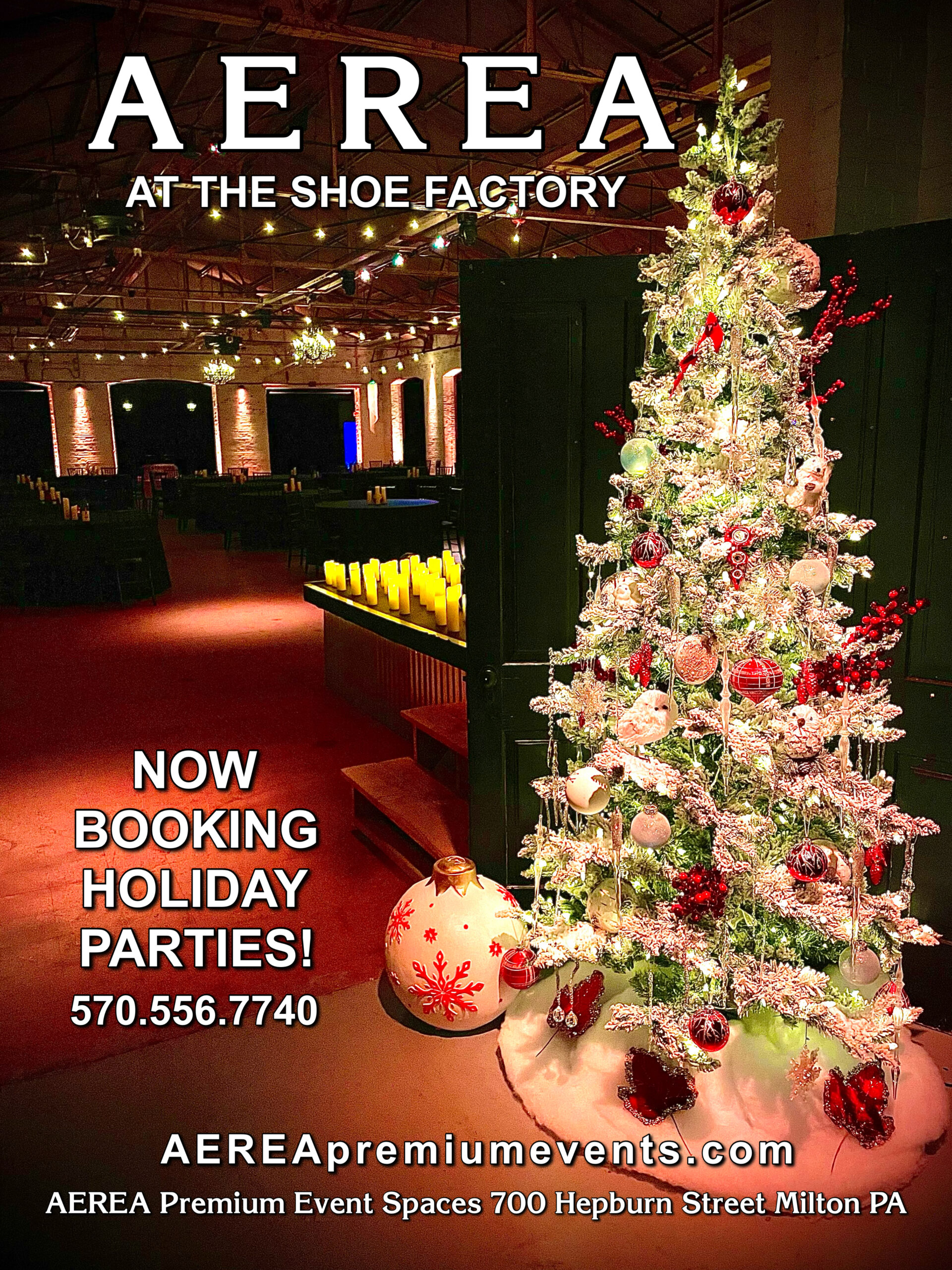 Make your holiday party unforgettable at AEREA at The Shoe Factory — a stunning industrial-chic venue in the heart of Milton, PA. With warm lighting, elegant décor, and plenty of room for dining and dancing, AEREA provides the perfect backdrop for your company gathering or festive celebration.Now booking holiday parties!